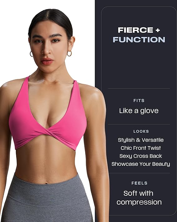 • The Sienna twist womens sports bra featuring thin crossed back straps and padding, despite small straps, it doesn’t bite into your traps and cause neck pain