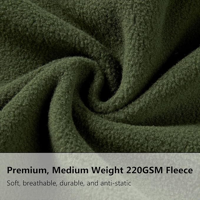 Fabric typeMade out of 100% Polyester, that is mid-weight 220GSM fleece: Soft, breathable, moisture wicking and resistant, durable, anti-static and anti-pilling