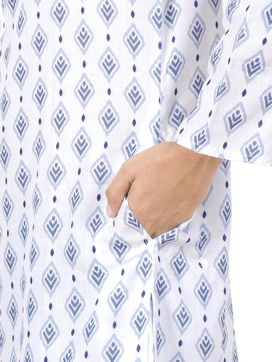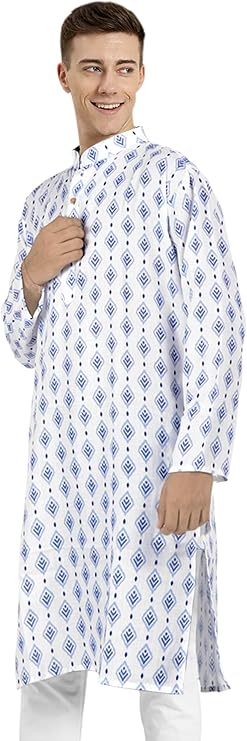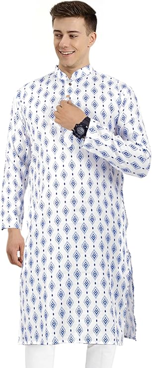Kurta Fabric: Linen Cotton, Kurta Features: Knee Length, Printed, Full Sleeves, Regular Fit, Mandarin Collar, Front Button Placket with Button Closure.
