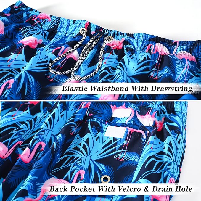 - Mesh Liner and Pockets — The beach shorts with mesh liner have 2 slanted hand pockets and 1 back pocket with velcro and drain hole, effective storage wallet, key or other small items.