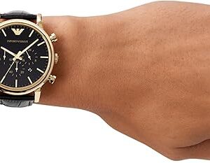 - An oversized black dial with stainless steel accents and a black genuine leather strap give this Emporio Armani watch a cool, metropolitan look.