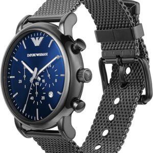 - An oversized black dial with stainless steel accents and a black genuine leather strap give this Emporio Armani watch a cool, metropolitan look.
