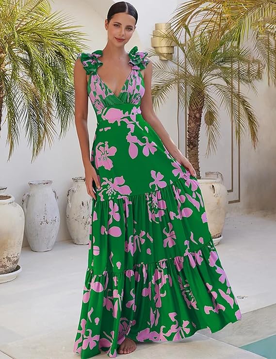 FLAXMAKER Blue and White V Neck Lace Up Strip Plant Prints One Piece Swimsuit and Skirt/Sarong(Green Swimsuit and Skirt)
