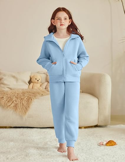 Girls 2 Piece Outfit Drop Shoulder Zip Up Hoodies and Sweatpant Clothing Set with Pockets(Light Blue)