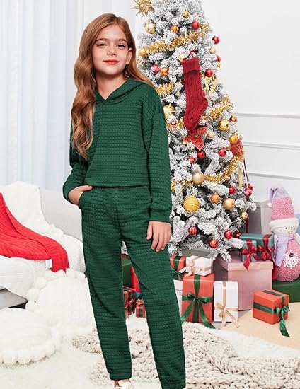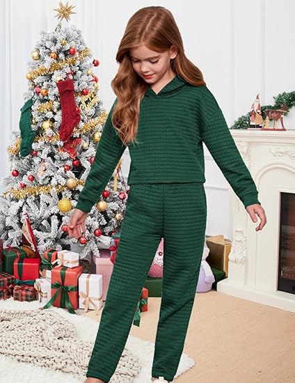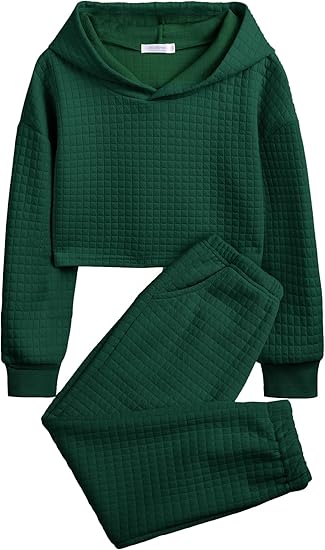 - Feature: Girls sweatsuit sets with plaid jacquard fabric,the hoodied sweatshirt features pullover, full sleeve ,waffle, drop shoulder, solid color; the jogger pants feature simple color, sloped pockets, high elastic waistband