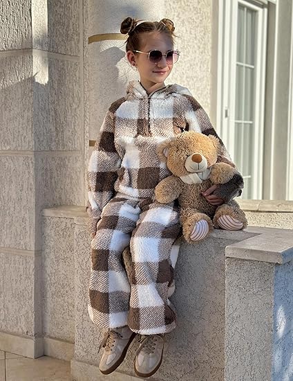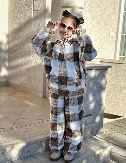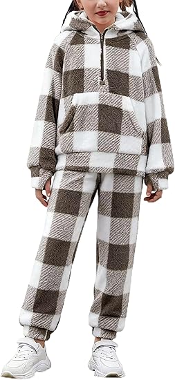 Girls 2 Piece Outfits Drop Shoulder Hoodie Half Zip Fluffy Sweatshirt and Fleece Pants Sweatsuit(Khaki plaid)
