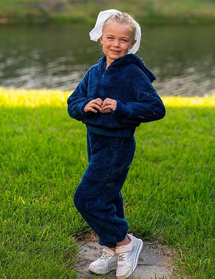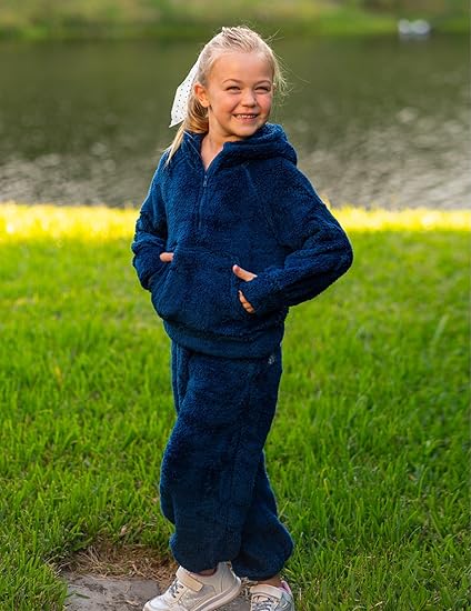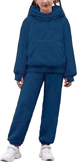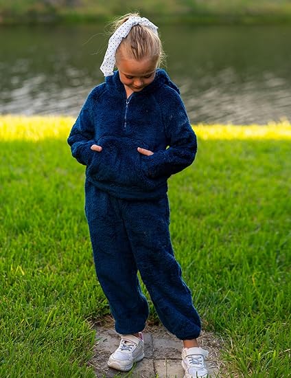 - Features: The Kids Fleece Sets come with a pullover top and long pants set.The fluffy sweatshirt has a half zip design,big kangaroo pockets,long sleeves with thumbholes.The adorable and cozy outfits for girls has a comfortable loose fit, allowing for easy movement and play
