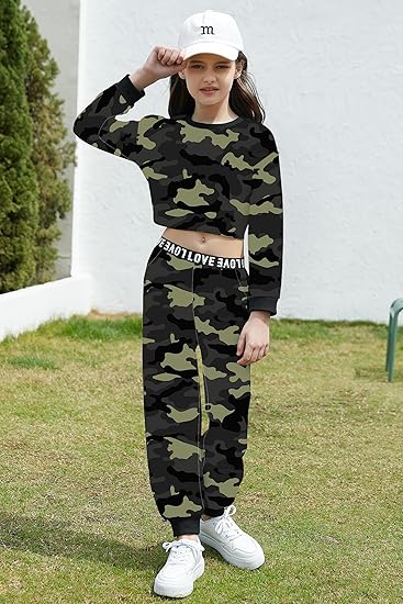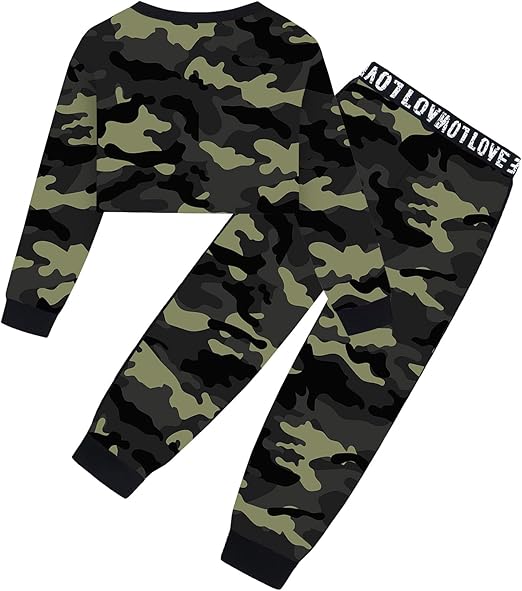 Girls 2 Piece Outfits Girls Cropped Sweatsuit Pants Outfit Clothes Set(Army Camo)