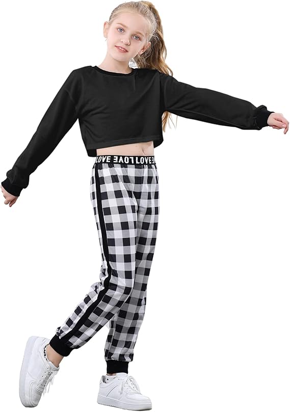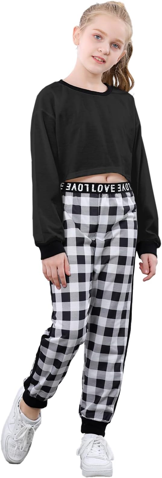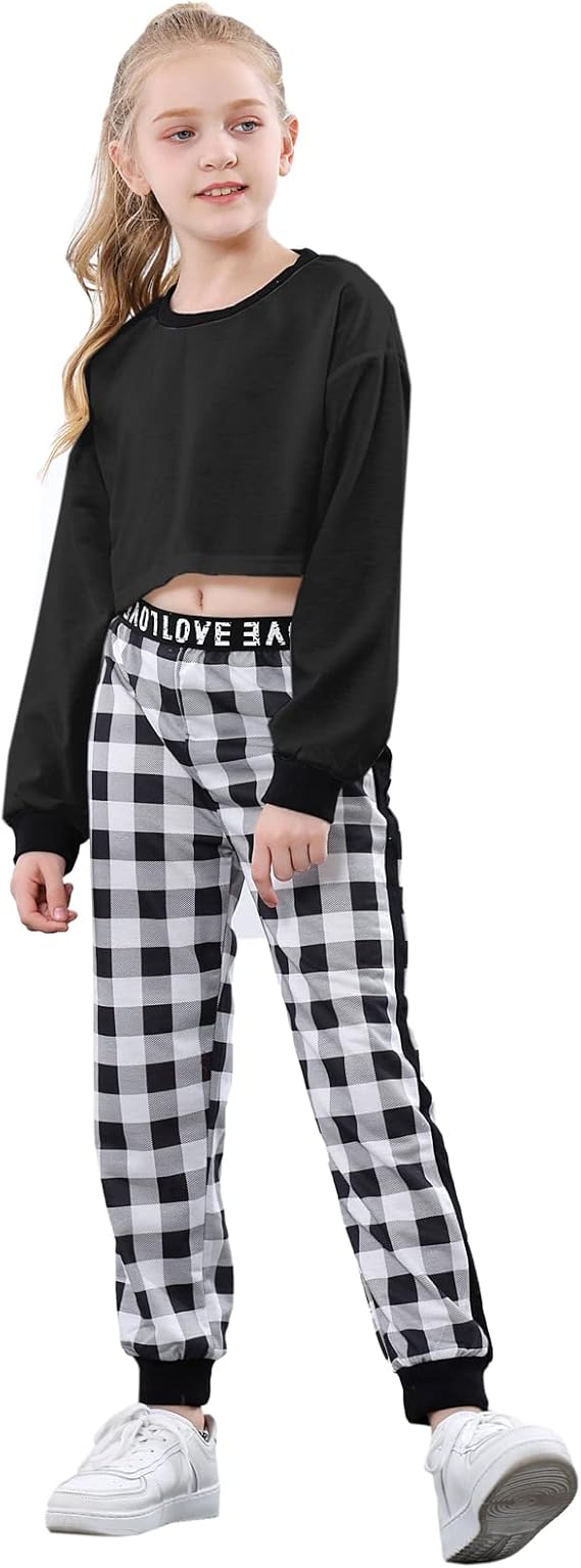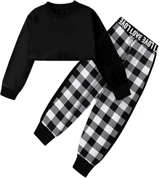 Girls 2 Piece Outfits Girls Cropped Sweatsuit Pants Outfit Clothes Set(Black plaid)
