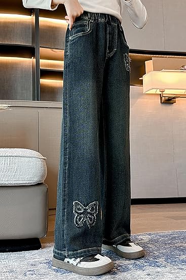 - Features: Wide-leg jeans for girls are designed for both comfort and a modern look. loose fit, full elastic waist for easy on and off, providing a secure. Stylish heart pattern design adds a modern twist to classic denim