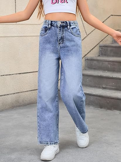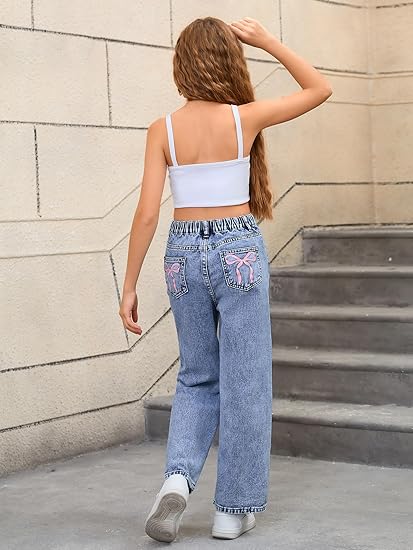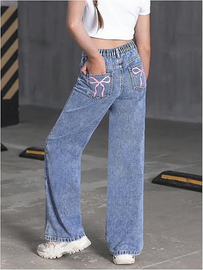 Girl’s Bow Print Back Zipper Fly Elastic High Waist Denim Pants Basic Wide Leg Jeans (pant 2)