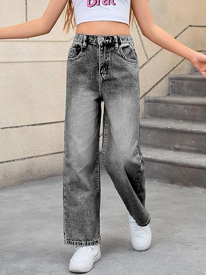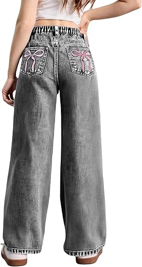 Girl’s Bow Print Back Zipper Fly Elastic High Waist Denim Pants Basic Wide Leg Jeans (pant 5)