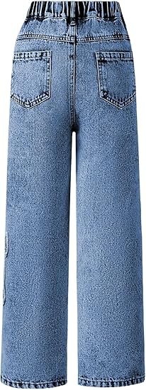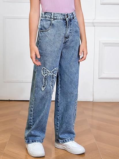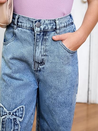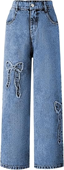 Girl’s Bowknot Print Washed Jean Elastic Waist Denim Pants Straight Leg Trousers with Pockets (pant 3)