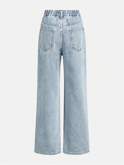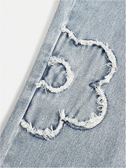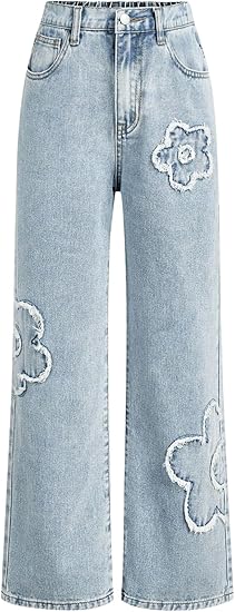 - Feature: Denim, graphic, washed, bow knots, high rise, straight leg, elastic waist, pockets, long length, vintage