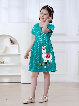 Girls Cartoon Appliques Dress Cotton Summer Short Sleeve Dresses Casual Jersey Skirt(Alpaca Green)