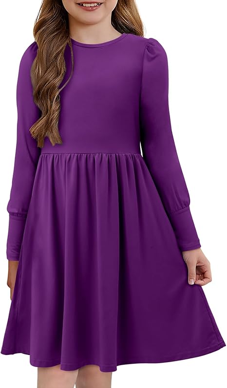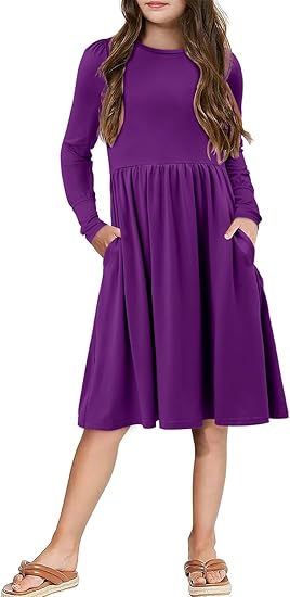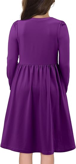 Girls Casual Long Sleeve Dress A Line Flowy Swing Dresses with Pockets (Purple)