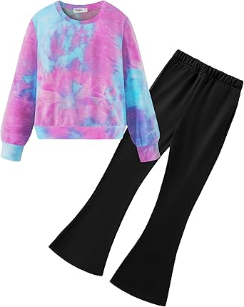 - Design:Girls 2 piece outfits, round neck long sleeve pullover sweatshirt with graphic print, hight elastic waist bell bottom pants with fashion print and pockets, super cute and comfy clothes for girls.