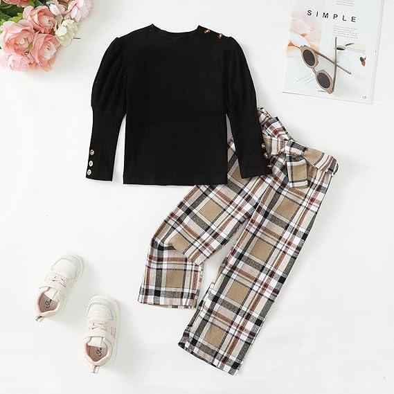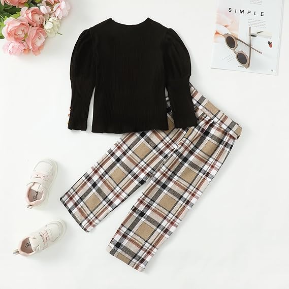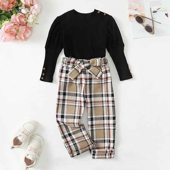 Girls Clothes 2 Piece Outfit Kids Long Sleeve T Shirt Pant Set Cute Fall Winter Outfits for Girl(Plaid Black)