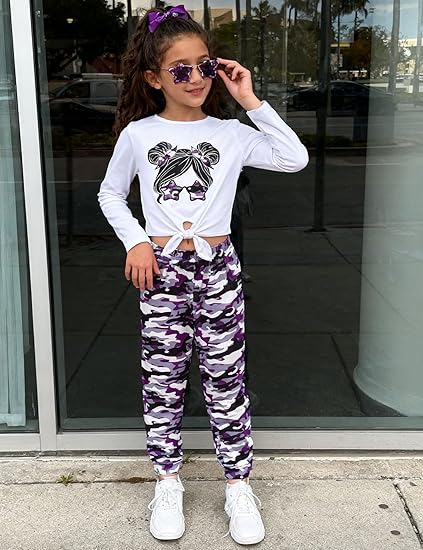 Girls’ Clothing Sets Bow Knot Long Sleeve T-Shirt & Camo Print Elastic Waist Pants Girls Clothes Size(Purple)