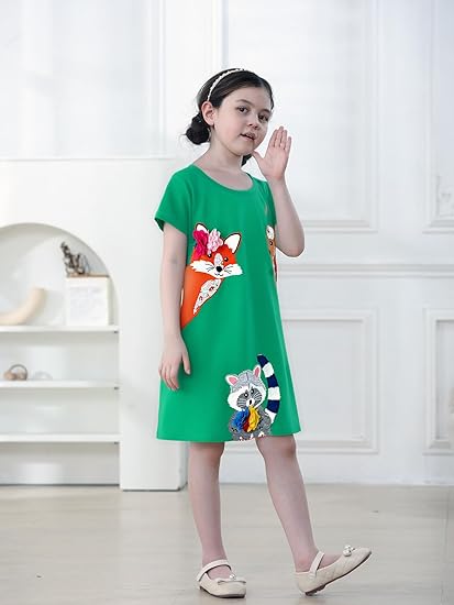 Girls’ Cotton Short Sleeve Dresses Cute Stripe Cartoon Patterned Casual Sundress(Green Fox Cat)