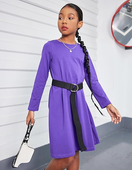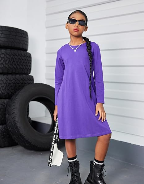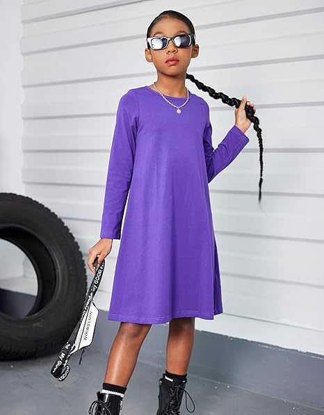 Girls Dress Kids Long Sleeve Solid Color Casual T-Shirt Dress(Purple)