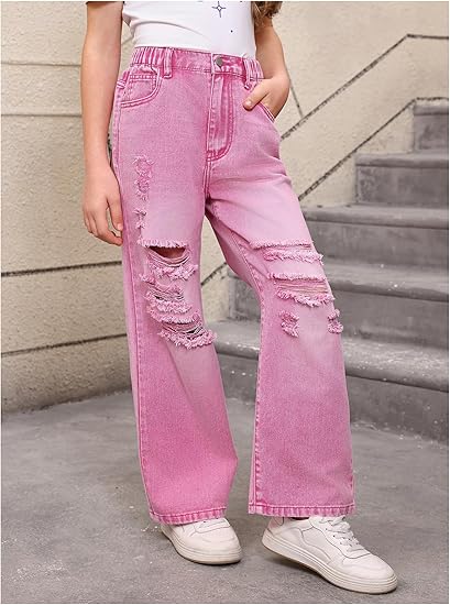 Girl’s Elastic High Waisted Ripped Baggy Jeans Wide Leg Distressed Denim Pants (Pant 3)