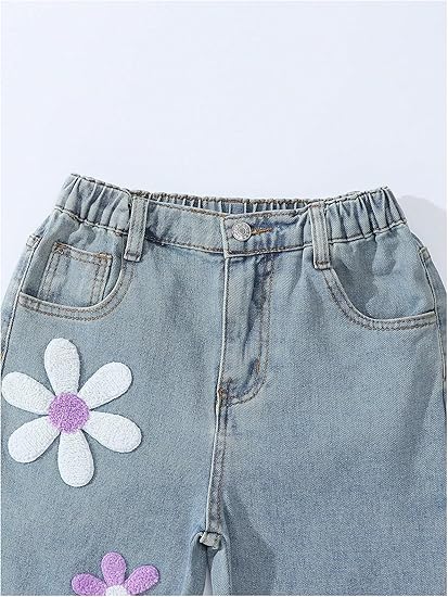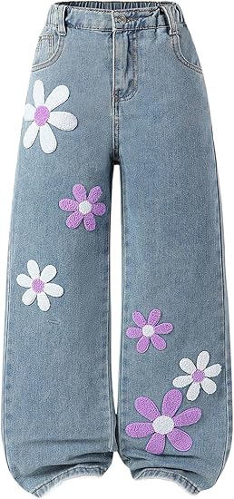 Girl’s Floral Baggy Jeans Cute Wide Leg Denim Pants Elastic Waist Denim Jeans with Pockets (Blue and Purple)