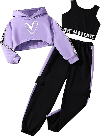 Girls Graphic 3 Piece Outfits Workout Hoodie Crop Tank and Sweatpants Set(Purple)