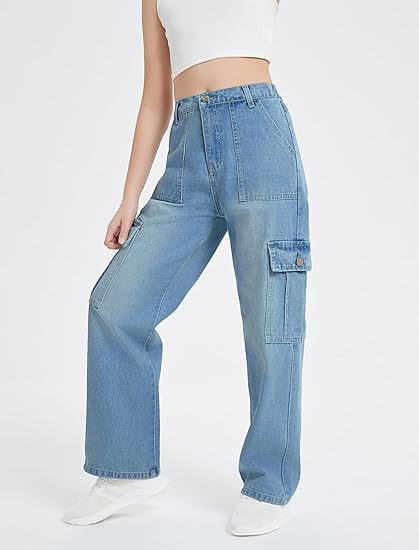 Girls Jeans Cargo Baggy Wide Leg Denim Straight Loose Pants Tween High Elastic Waistband with Pockets (Pant 2)