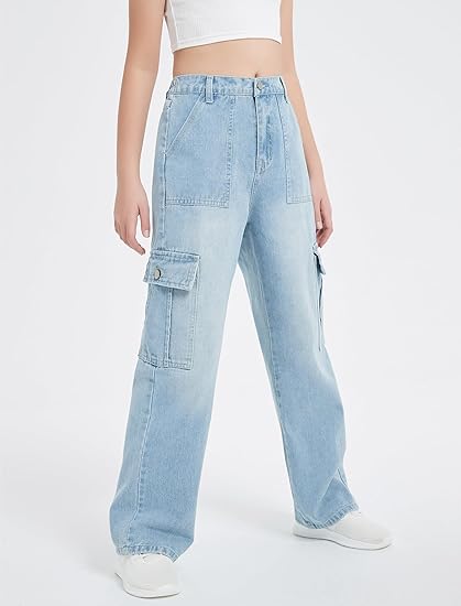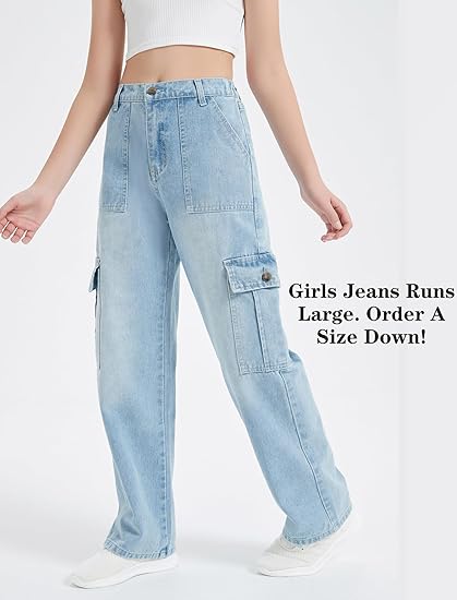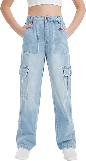 Girls Jeans Cargo Baggy Wide Leg Denim Straight Loose Pants Tween High Elastic Waistband with Pockets (Pant 3)