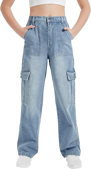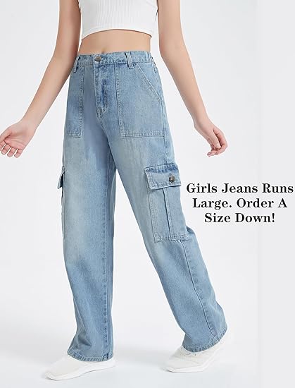 Girls Jeans Cargo Baggy Wide Leg Denim Straight Loose Pants Tween High Elastic Waistband with Pockets (Pant 4)