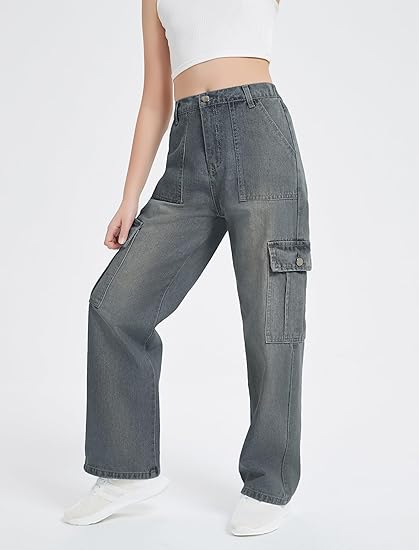 Girls Jeans Cargo Baggy Wide Leg Denim Straight Loose Pants Tween High Elastic Waistband with Pockets (Pant 5)