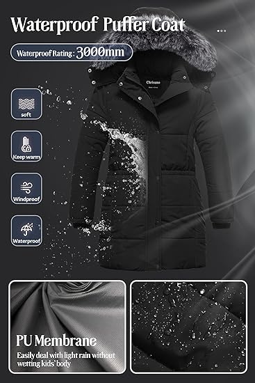 - ❄Protection For Wet Weather–Super soft snow and water proof.Shell fabric offers 3000 mm/3000 g of waterproof/breathable protection.Durable water repellent (DWR) finish sheds moisture and stains,keep kids dry on the wettest days.The mid-length design gives kids more protection from the cold wind.perfect for playing on the playing out in the snow , water piles etc