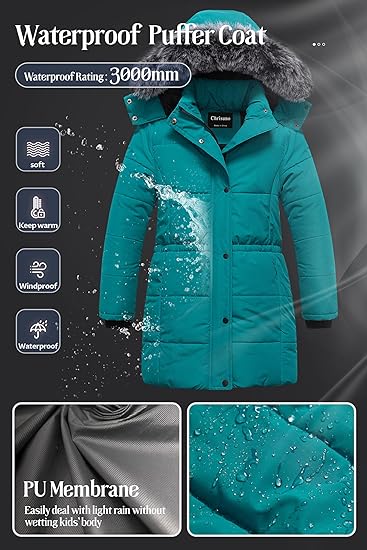 - ❄Protection For Wet Weather–Super soft snow and water proof.Shell fabric offers 3000 mm/3000 g of waterproof/breathable protection.Durable water repellent (DWR) finish sheds moisture and stains,keep kids dry on the wettest days.The mid-length design gives kids more protection from the cold wind.perfect for playing on the playing out in the snow , water piles etc