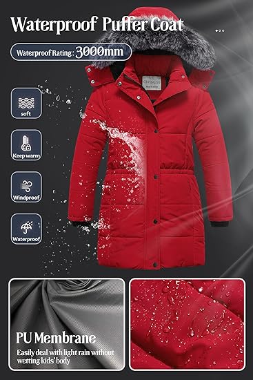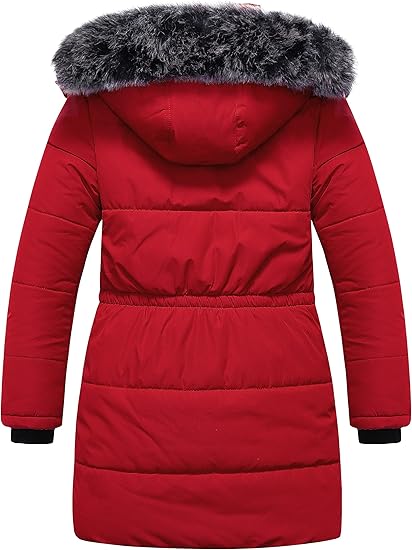 Girl’s Long Parka Warm Winter Coat Water Resistant Quilted Puffer Jacket Snow Outwear(Red)