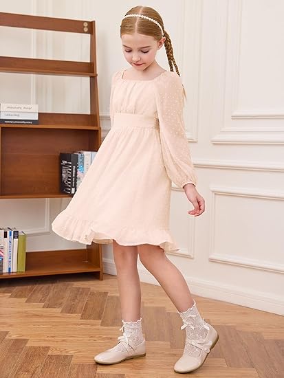 - Features:Casual and stylish elegant girls dress for your princess. Adorable & casual & cute style, long sleeves, ruffled hem, square neck, can also be worn as off shoulder style, a-line, elastic waist, classic solid color, above knee length, lined. Super flattering and swinging with each step