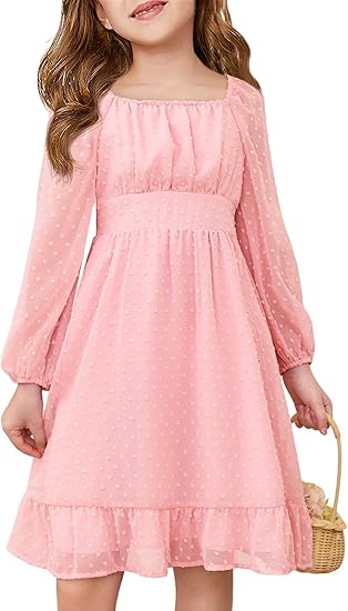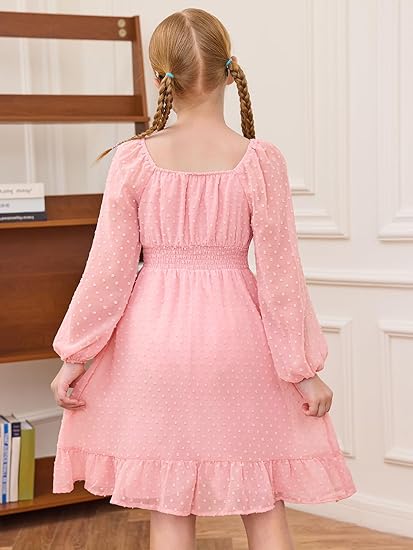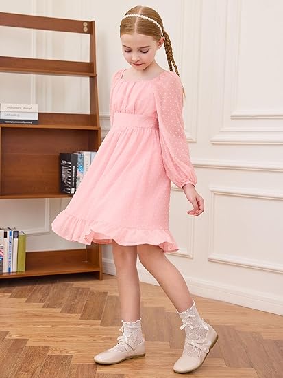 Girls Long Sleeve Dress Kids Ruffle Tiered Dress Swiss Dot Flowy A Line Dresses (Pink)