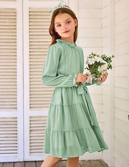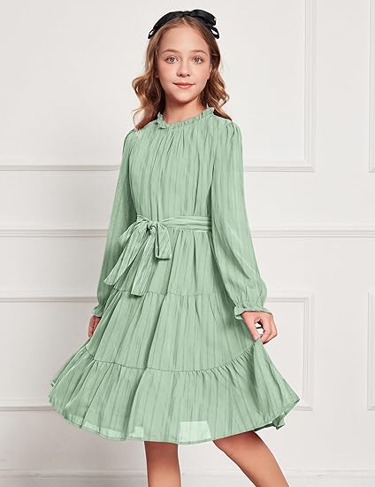 Girls Long Sleeve Dress Tween Fall Formal Party Holiday Midi Tiered Flowy Swing Dresses with Belt (Green)