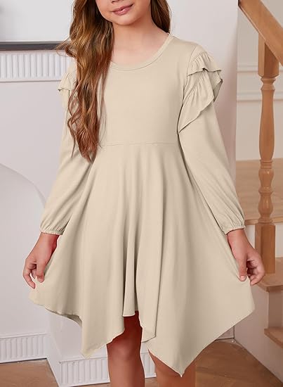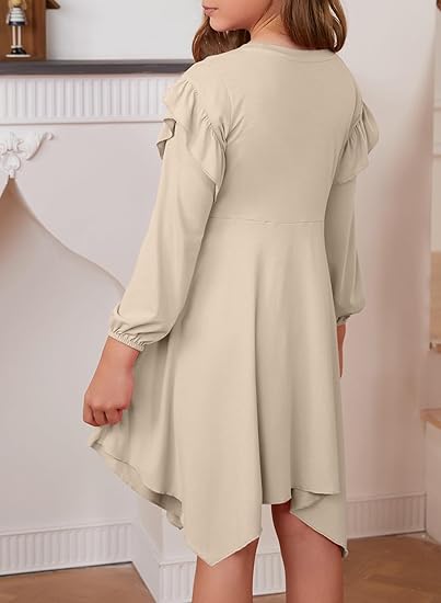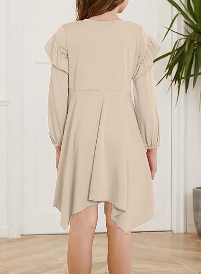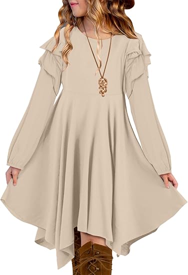 - FEATURES: Elevate your wardrobe with our girls elegant fall long sleeve dress, exquisite ruffle detailing along the high low hemline adds a touch of flair and sophistication, guaranteeing a head-turning appearance. Featuring tiered puff sleeves, this dress embraces the latest fashion trends, adding a playful and eye-catching element to your ensemble, with solid color design to offer versatility and endless styling options