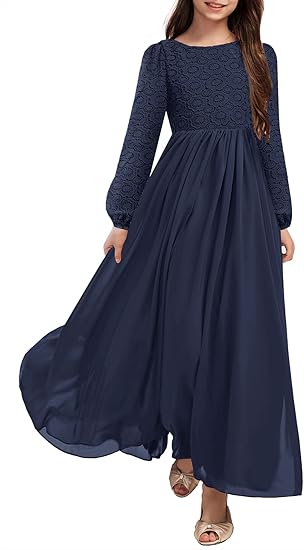 Girls Long Sleeve Maxi Dress Vintage Chiffon A-Line Formal Junior Bridesmaid Dresses for Fall Wedding Party(Navy Blue)