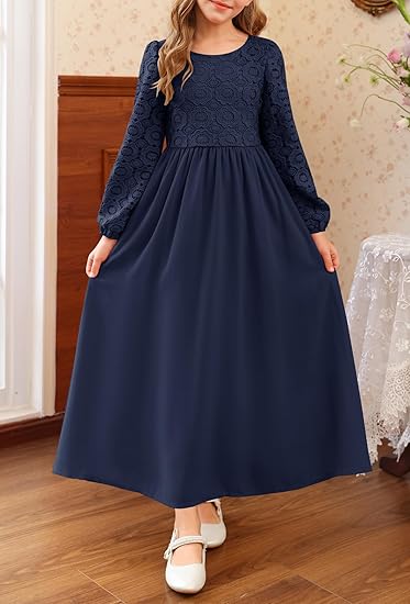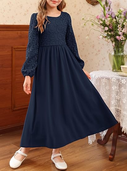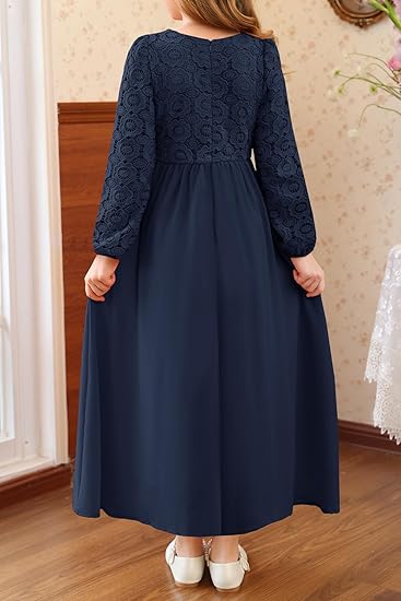 - Design: Vintage & Formal Style, Floral Lace Top and Chiffon Skirt, Solid Color, Round Neck, Crochet Lace Puff Long Sleeve, High Waist, Pleated, A-line, Concealed Zipper At Back, Ankle Length. Perfect for toddler girls/ little girls/tween girls/ junior girls dress
