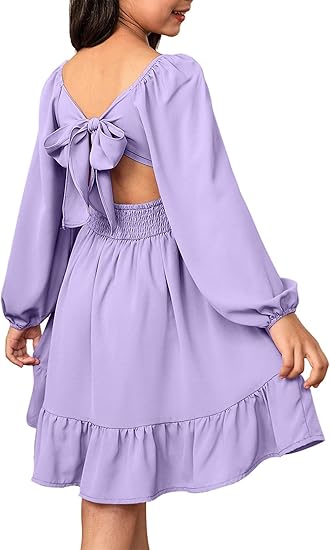Girls Long Sleeve Tie Back Dress Tween Fall Off Shoulder Dress (Purple)