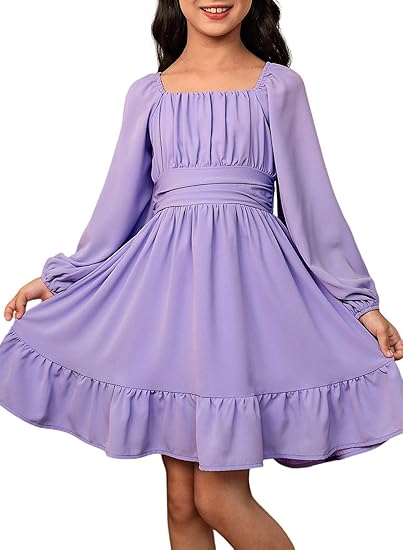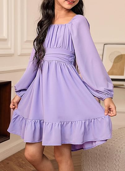 - FEATURES: The girl’s fall long-sleeved one shoulder dress features an adjustable tie closure on the back and ruffles on the lantern sleeves that are both stylish and easy to put on and take off, as well as the off shoulder flexbility. Also the combination of square neck, peplum hem, a-line, elastic waist, classic solid color and above knees length designs will bring your cute girl the fashionable look and trendy sense