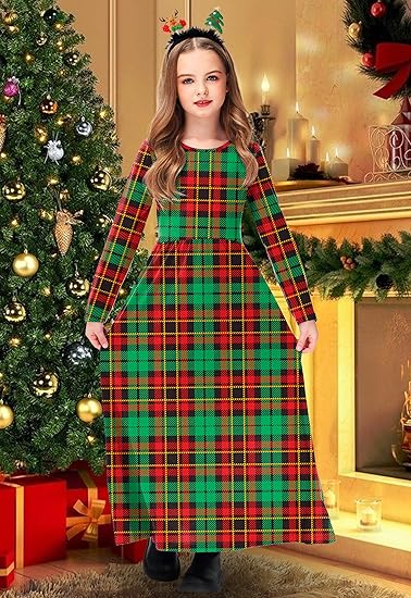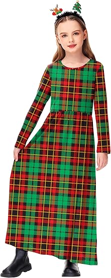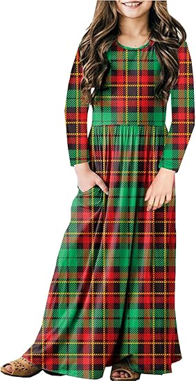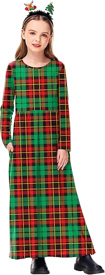 Girls Maxi Dress Casual Holiday Long Dresses with Pockets (Christmas Plaid)