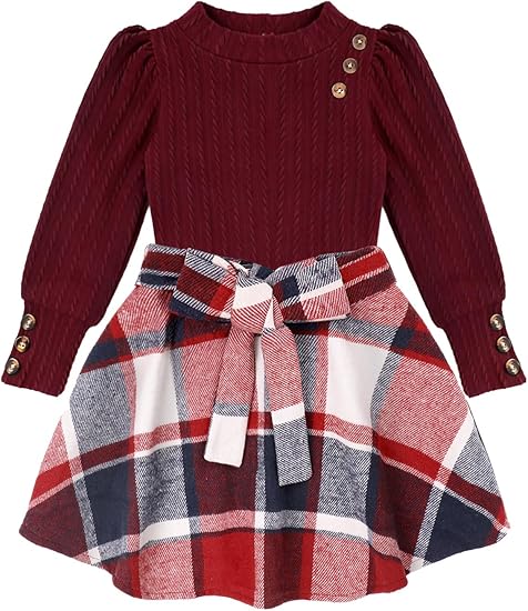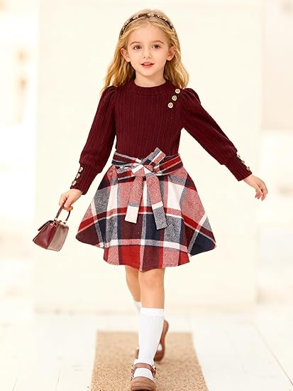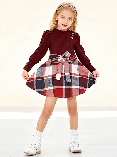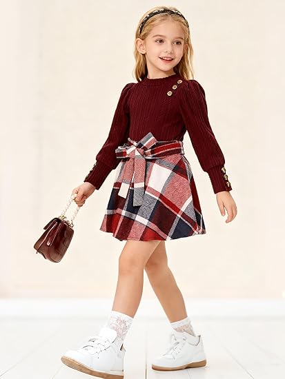 Be the first to review “Girls Skirt Sets Fall Outfits Puff Sleeve Crewneck Ribbed Knit Tops and Plaid Skirt Set Kids Fall Winter Clothes(Red)”