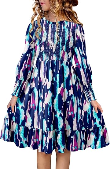 - Design: Puff long sleeve, ruffle round neck, elastic smock top, knee length, loose fit girls dresses