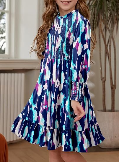 Girls Smocked Dress Casual Puff Long Sleeve Ruffle Neck Dresses (Multicolour)