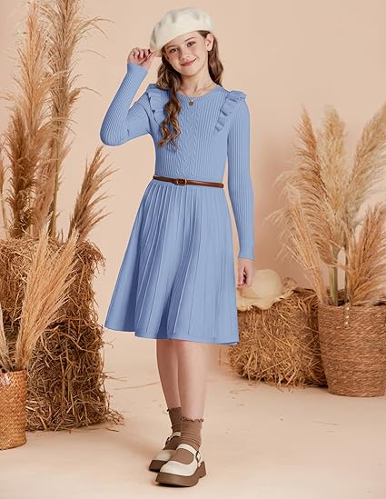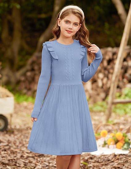 - Stylish Design: This adorable girls’sweater dress features a classic crew neck with ribbed trim, a charming cable knit pattern on the front, and playful ruffle accents on the shoulders. Long sleeves with ribbed cuffs provide extra warmth, while the fitted waist and A-line skirt create a sweet, twirl-worthy silhouette