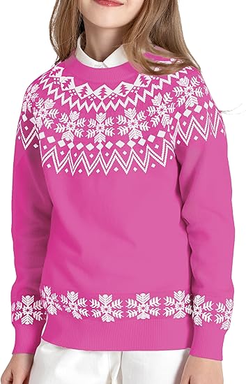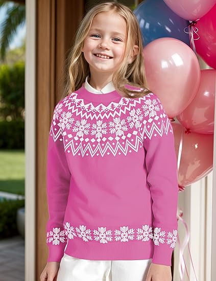 Girls Sweaters 100% Cotton Kids Sweater Holiday Teen Winter Pullover Crew Neck Long Sleeve Knit Top(Dark Pink & Snowflake)