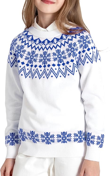 Girls Sweaters 100% Cotton Kids Sweater Holiday Teen Winter Pullover Crew Neck Long Sleeve Knit Top(White-blue & Snowflake)